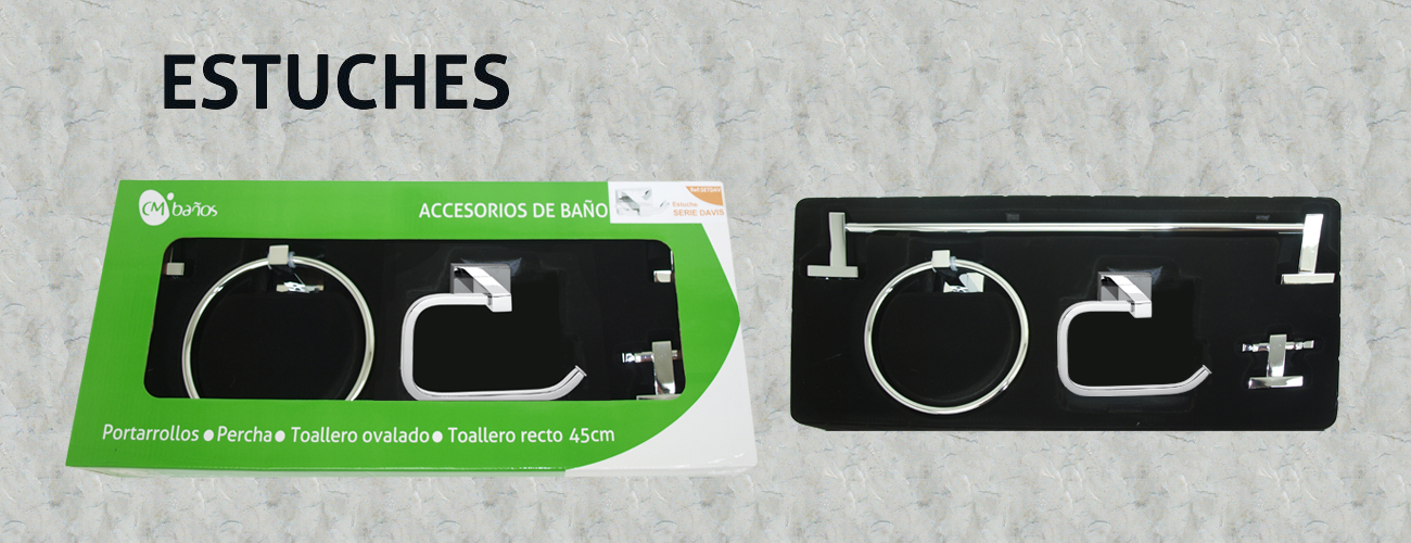 Estuches que incluyen variedad de artículos de algunas de las series más destacadas de Cromados Modernos para poder conjuntar los accesorios del baño de la mejor forma posible.