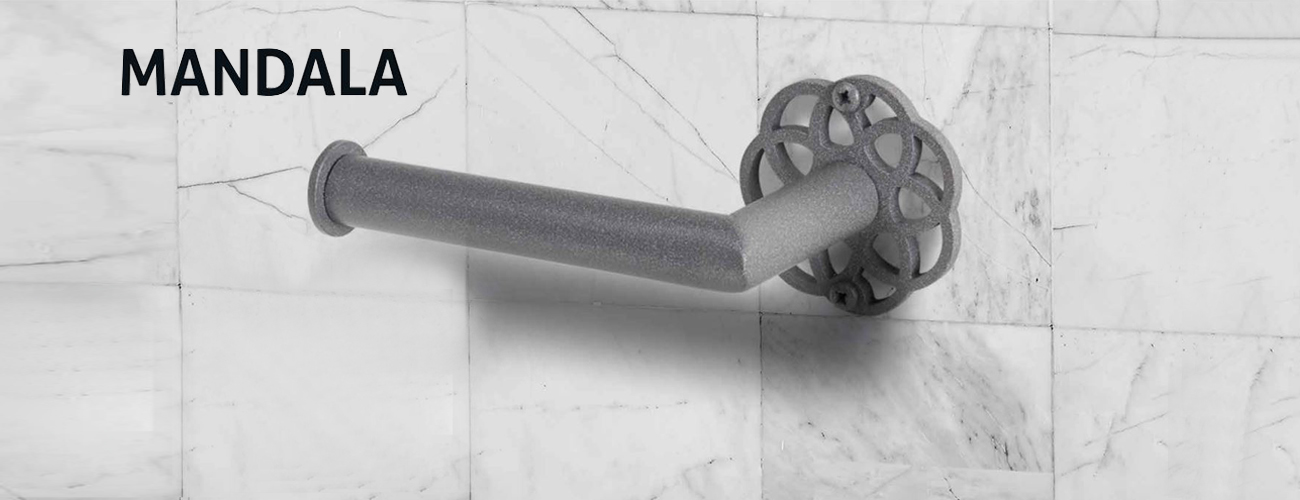 Serie de accesorios de baño MANDALA fabricada en acero inoxidable, latón y zamak lacado con cuatro tipos de acabados a elegir: Gris piedra, blanco texturizado, jordania y marrón forja.