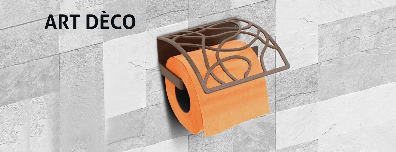 Serie de accesorios de baño ART DÈCO fabricada en acero lacado con textura y con tres tipos de acabados a elegir: Marrón forja, blanco texturizado y negro forja.