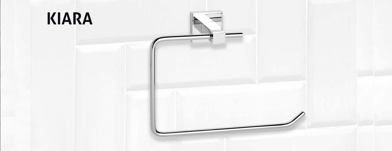 Serie de accesorios de baño KIARA fabricada en aleación de zamak y acero inoxidable.