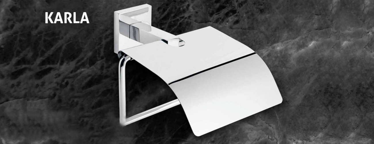 Serie de accesorios de baño KARLA fabricada en aleación de zamak y acero inoxidable.