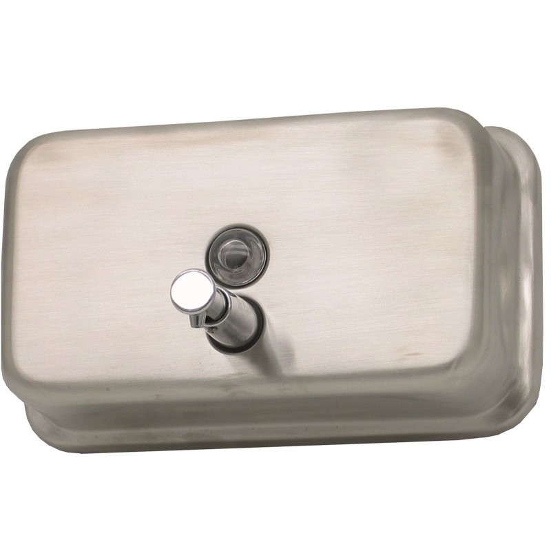 DISPENSADOR DE JABÓN LÍQUIDO HORIZONTAL FABRICADO EN ACERO INOXIDABLE SATINADO.