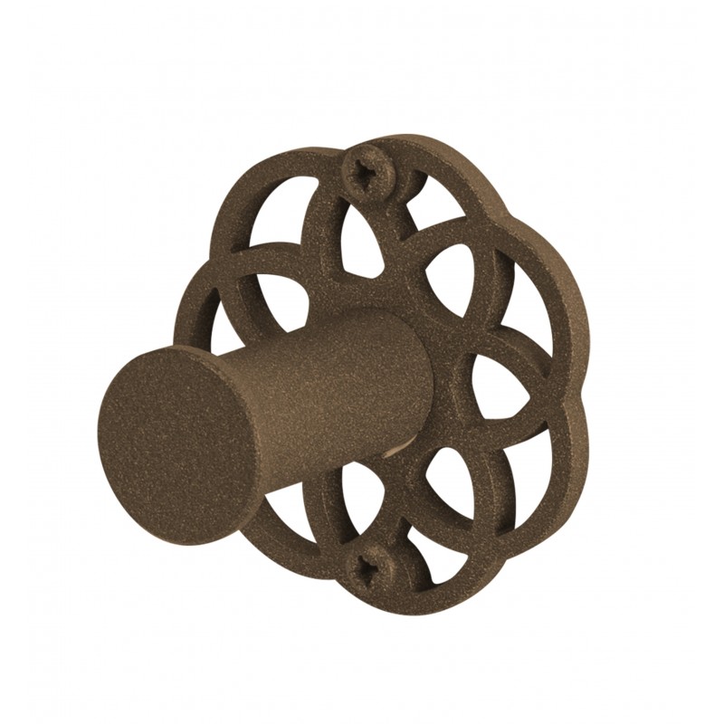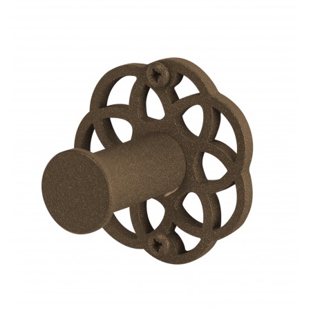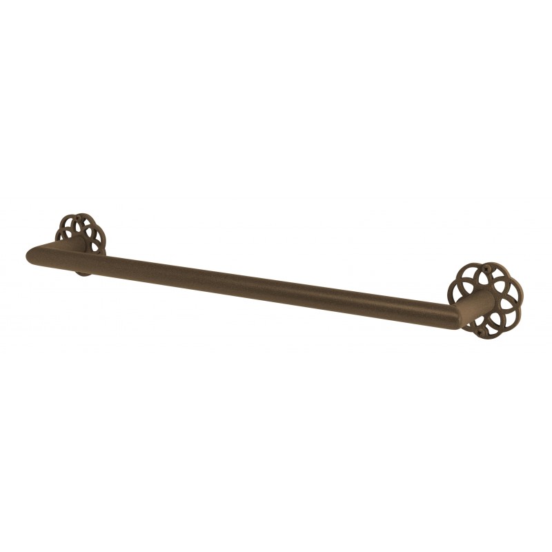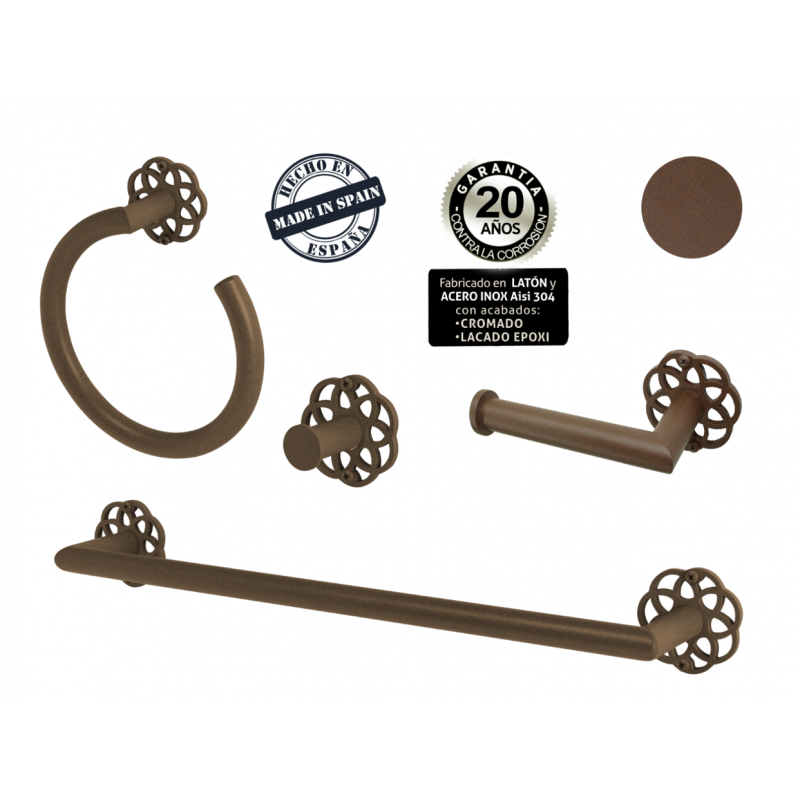 ESTUCHE MANDALA FABRICADO EN ACERO INOXIDABLE, LATÓN Y ZAMAK CALADO Y ACABADO EN MARRÓN FORJA QUE INCLUYE PORTARROLLOS SIN TAPA, PERCHA, TOALLERO REDONDO Y TOALLERO RECTO.