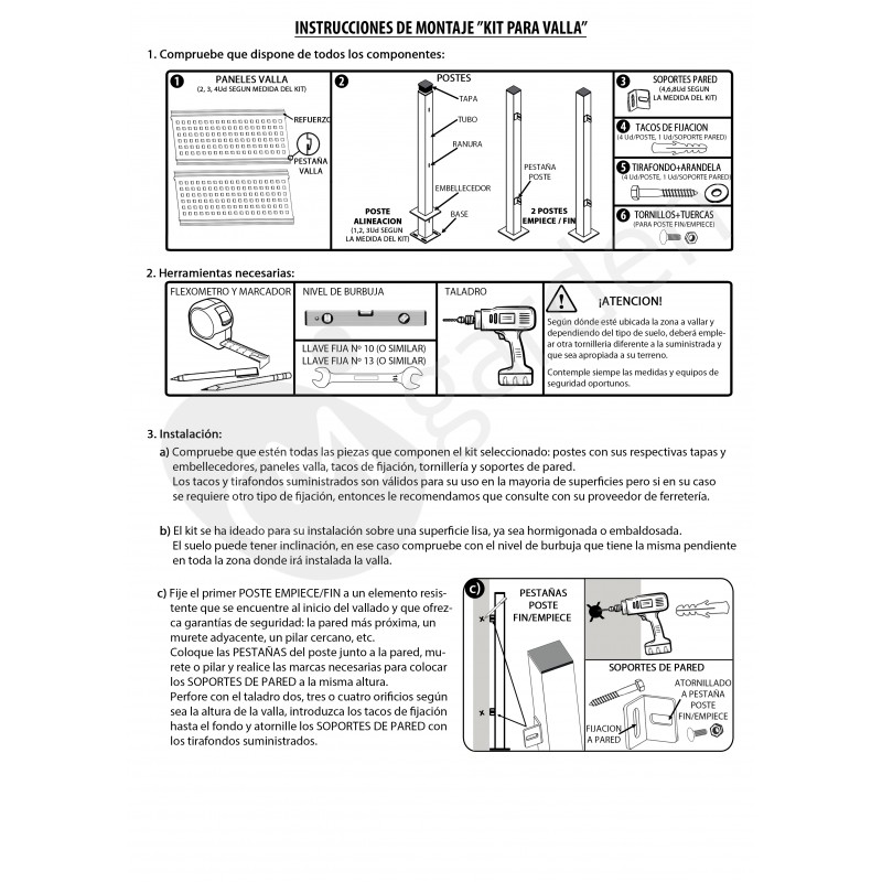 LOS POSTES DE EMPIECE/FIN DISPONEN DE PESTAÑAS EN UNO DE SUS LADOS PARA FIJARLOS A LOS SOPORTES DE PARED QUE SE SUMINISTRAN CONJUNTAMENTE. USTED PUEDE FIJAR ESTOS SOPORTES AL ELEMENTO RESISTENTE QUE TENGA AL INICIO DEL VALLADO (MURO, PILAR, ETC).
