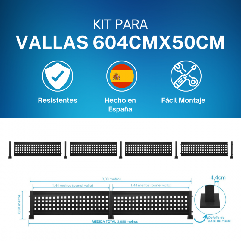 ESTE KIT INCLUYE: - 4 PANELES DE VALLA - 2 POSTES PRINCIPIO/FIN - 3 POSTE DE ALINEACIÓN. PARA CADA REMATE SE SUMINISTRAN LAS TUERCAS Y TORNILLOS CORRESPONDIENTES.