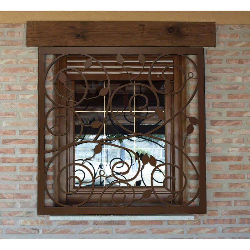 REJA DE VENTANA FLORAL MARRÓN FORJA FABRICADA EN ACERO LACADO AL HORNO EPOXI, PROPORCIONANDO UNA GRAN DURABILIDAD.